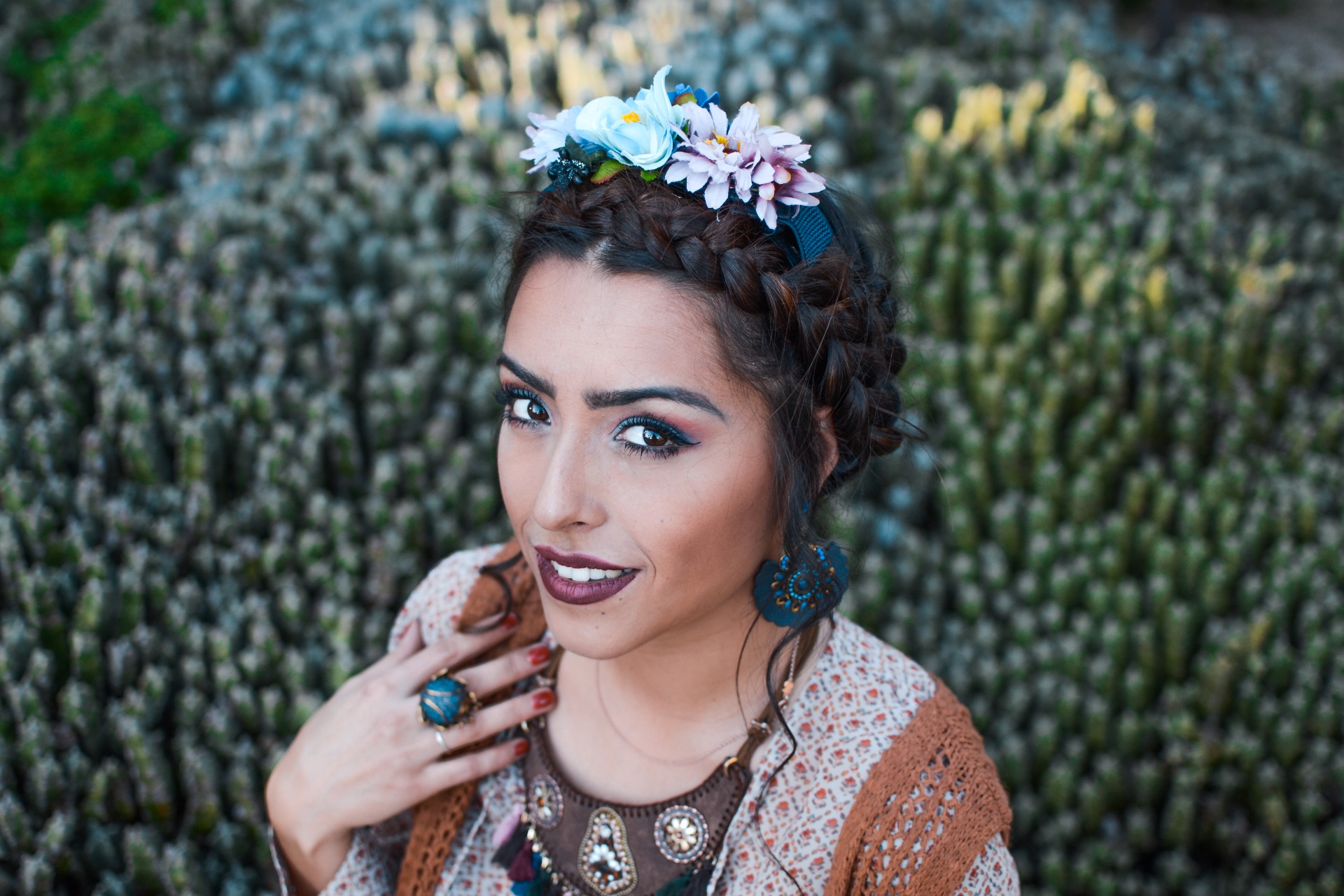 Maquillaje de día intenso en tonos rojos,granates y azules, dándole agresividad al look, complementado con un recogido trenzado y sobrio .