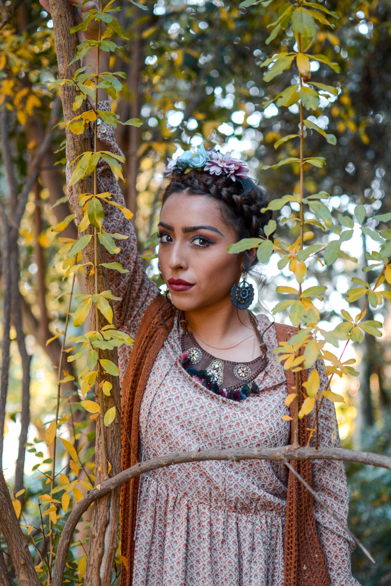 Con este vestido floreado de tonos cálidos , hemos querido representar un estilo más hippie por su tipo de corte y vuelo.